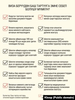 «Мунун дагы кошумча себептери бар — бул документтерди кеч тапшыруу, анын себебинде элчилик өлкөгө кирүү мерчемделип жаткан күнгө чейин документтерди карап чыкканга жетишпей калат, ошондой эле Шенген аймагындагы бара турган жери менен анын максаты тууралуу күмөндүү маалыматтардын көбөйүп кеткени себеп», — деп түшүндүрдү өкүлчүлүк.