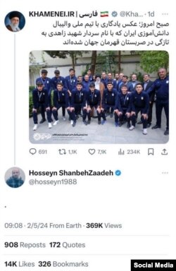 Тарапташтары Ирандын жогорку руханий лидери, аятолла Али Хаменеинин X (мурдагы Twitter) социалдык түйүнүндөгү постторунун биринин алдына Шанбезаденин аккаунтунан чекит белгиси гана коюлган комментарийдин сүрөтүн жарыялап, аны ушул үчүн кармап кетишкен болушу ыктымал экенин боолгоп жатышат.