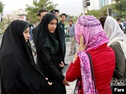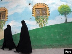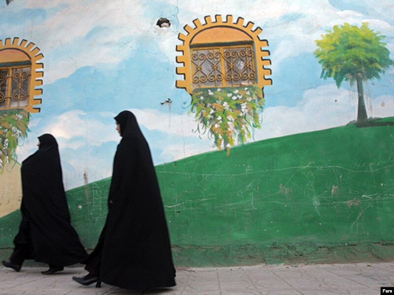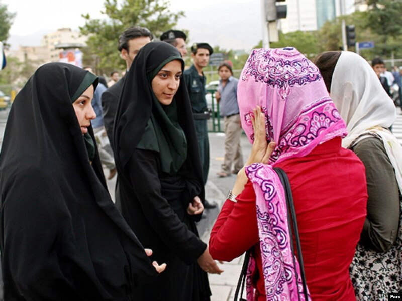 Кара кийинген эки полиция аял (солдо) ирандык аялдарды шариятка ылайык кийинип жүрүүнүн зарылдыгын түшүндүрүшүүдө.