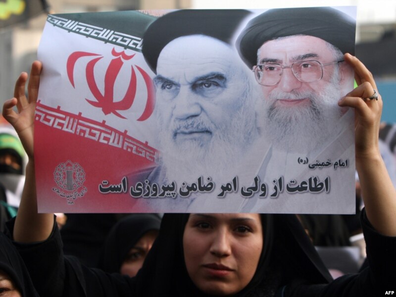 Иран жетекчилигин колдогон аял өлкөнүн руханий көсөмү Али Хаменейи (оңдо) менен Ислам Республикасынын негиздөөчүсү Аятолла Рухалла Хоменейинин сүрөтүн көтөрүп баратат. Тегеран. 30-декабрь 2009