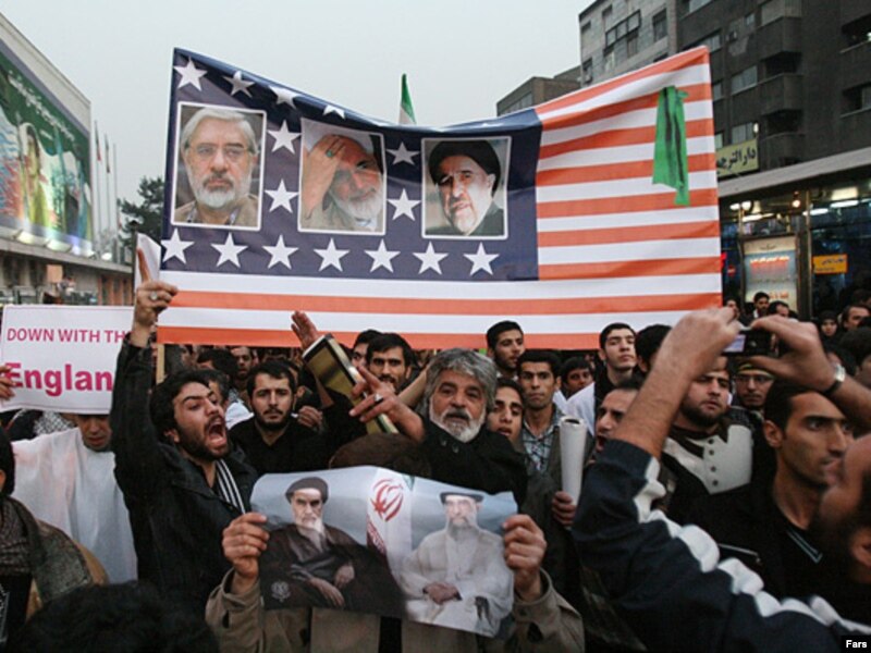 Өкмөт тарапкерлери мурдакы президент Мохаммад Хатами(оңдо), реформачыл Улуттук ишеним партиясынын төрагасы Мехди Каруби (ортодо) жана Иран оппозициясынын ана башы Мир Хусейн Мусавинин сүрөттөрү жабыштырылган АКШнын туусун көтөрүп баратышат.Тегеран. 30-декабрь 2009