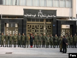 Иран полициясы өкмөт имаратынын алдында бийлик тарапкерлеринин демонстрациясына көз салып турат. Тегеран, 30-декабрь 2009