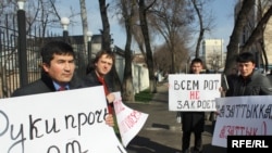 Акциянын катышуучулары “Азаттыкка" – азаттык", “Руки прочь от правды”, “Азаттык обого чыксын”, “Баардыгынын оозун баса албайсың”,-деген жазуулары бар плакаттарды кармап чыгышты.