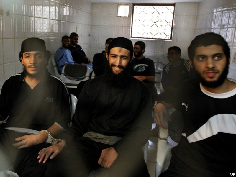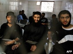 Йемендеги "ал-Каиданын" мүчөлөрү деп шектелип кармалган Хасан Насир Марвала (солдо), Мохаммед Касем Али Гавли(ортодо), Абдулла Ахмед Регаб Матари (оңдо) Санадагы сотто. 26-январь 2010