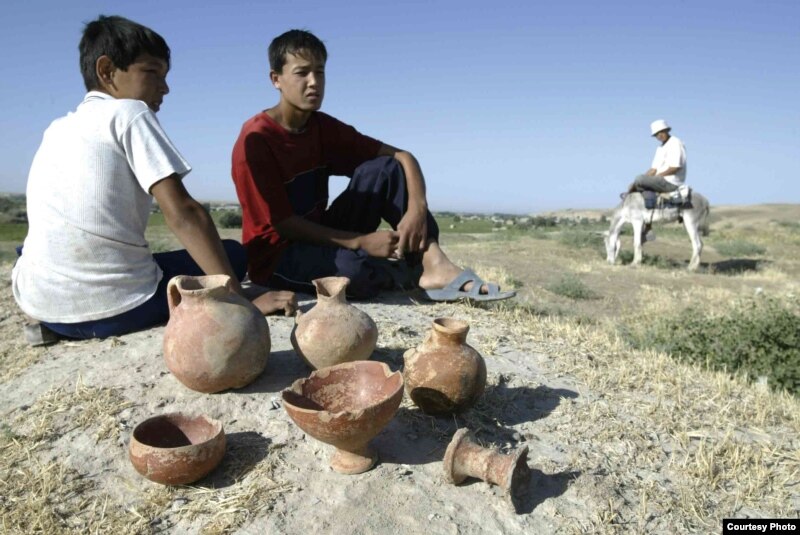 Байыркы чопо идиштердин жанында отурган балдар, "Эпоха" журналынан сүрөт