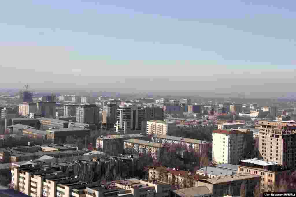 Бишкекте көп кабаттуу имараттар козу карындай жайнаганы менен эң бийиги 18 гана кабат. Бул сүрөттөр “Россия” бизнес борборунун 18-кабатынан, борбордук сааттын үстүнөн жана калаанын түштүк тарабындагы понарамадан тартылган. Бишкекти бийиктен караган адамга түтүнү буркураган Бишкек жылуулук борборунун түтүктөрү дароо көзгө илинет. Автомашинанын көптүгүнөнбү, айтор шаардын үстүн ар дайым кара түтүн басып турарын байкоого болот.