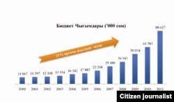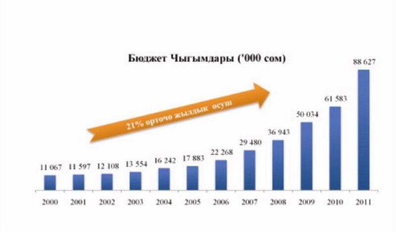2000-жылы бюджеттин чыгаша бөлүгү 11 млрд. сом болсо, 2011-жылы 88 млрд. сомго жетти. 2000-жылга салыштырмалуу 2011- жылдын бюджети сегиз эсе өстү.