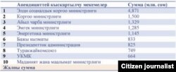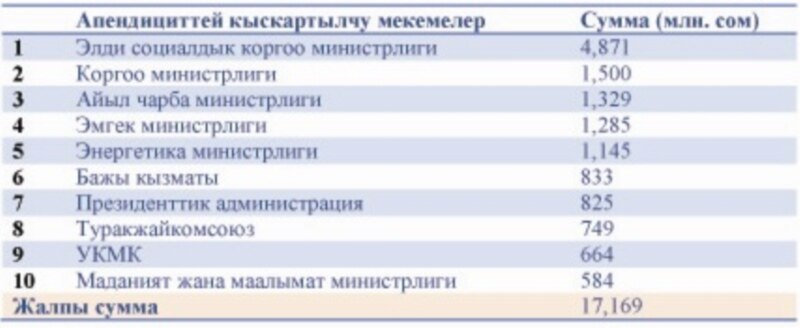 Кыскартыла турган ири он мекеме төмөндө жазылды. Үнөмдөлгөн сумма -17,2 млрд. сом же 365 млн. доллар. Бул мекемелер кыскартылмайынча Кыргызстандын экономикасы аксап жүрө берет. Жарым өлүк, бирок тирүү деле эмес. Ошону менен элдин жашоо деңгээли боюнча Тажикистандан дагы артта кала берет, минтип отурсак жакында Кыргызстан деле Ооганстандан ылдый түшүп кетет.