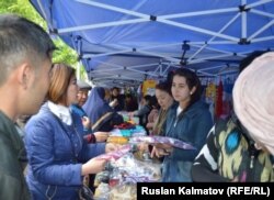 Жалал-Абад шаарындагы Барпы театрынын алдындагы аянт бул күнү кыргыз-өзбек ишкер аялдары даярдап чыгарган өндүрүмгө толду.