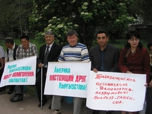 “Атамекен Америка менен бирге” коомдук бирикмесинин мүчөлөрү жана алардын тилектештери ишембиде (10-майда) уюштурган пикетке 20га жакын адам чыкты.